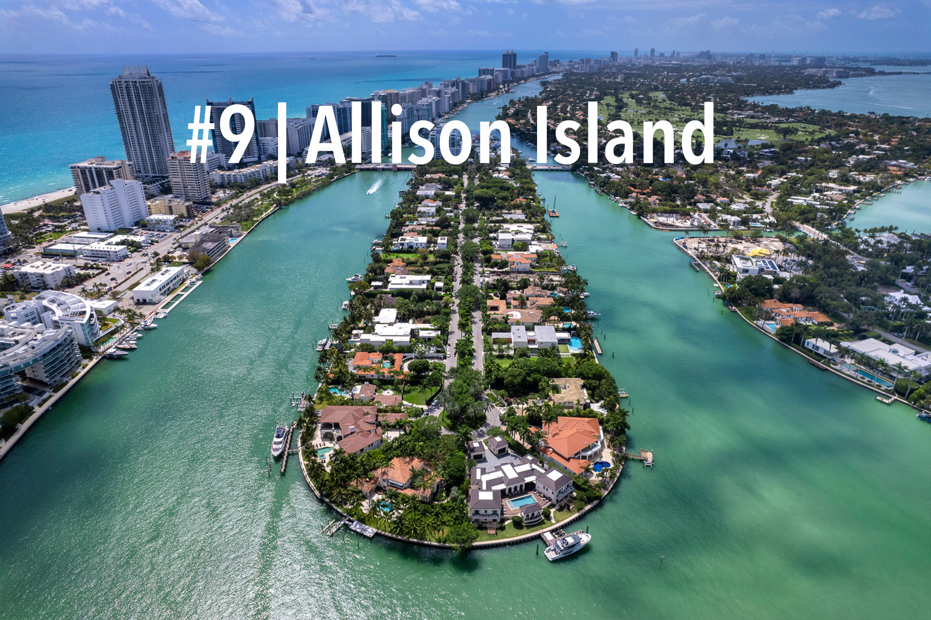 9. Allison Island is a small, guard-gated community with exclusively waterfront homes! Here, 6480 Allison Road, a stunning modern waterfront home, sold in 2023 at $22.5 million! Click here to see all waterfront homes for sale in this luxury neighborhood.